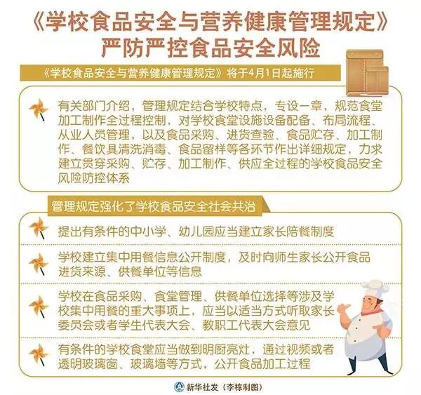 日前,教育部、國家市場監(jiān)管總局、國家衛(wèi)健委共同發(fā)布《學(xué)校食品安全與營養(yǎng)健康管理規(guī)定》:中小學(xué)幼兒園應(yīng)建立集中用餐陪餐制度,每餐均應(yīng)有學(xué)校相關(guān)負(fù)責(zé)人與學(xué)生共同用餐,做好陪餐記錄,有條件的中小學(xué)幼兒園還應(yīng)建立家長陪餐制度;中小學(xué)幼兒園一般不得在校內(nèi)設(shè)置小賣部、超市等食品經(jīng)營場所?!兑?guī)定》將從4月1日開始執(zhí)行?!兑?guī)定》還特別提出,中小學(xué)、幼兒園食堂要對每餐次加工制作的每種食品成品進行留樣,并且留樣食品必須由專柜冷藏保存48小時以上。佛山也將于5月1日正式實施《佛山市單位食堂食品安全監(jiān)管辦法》。